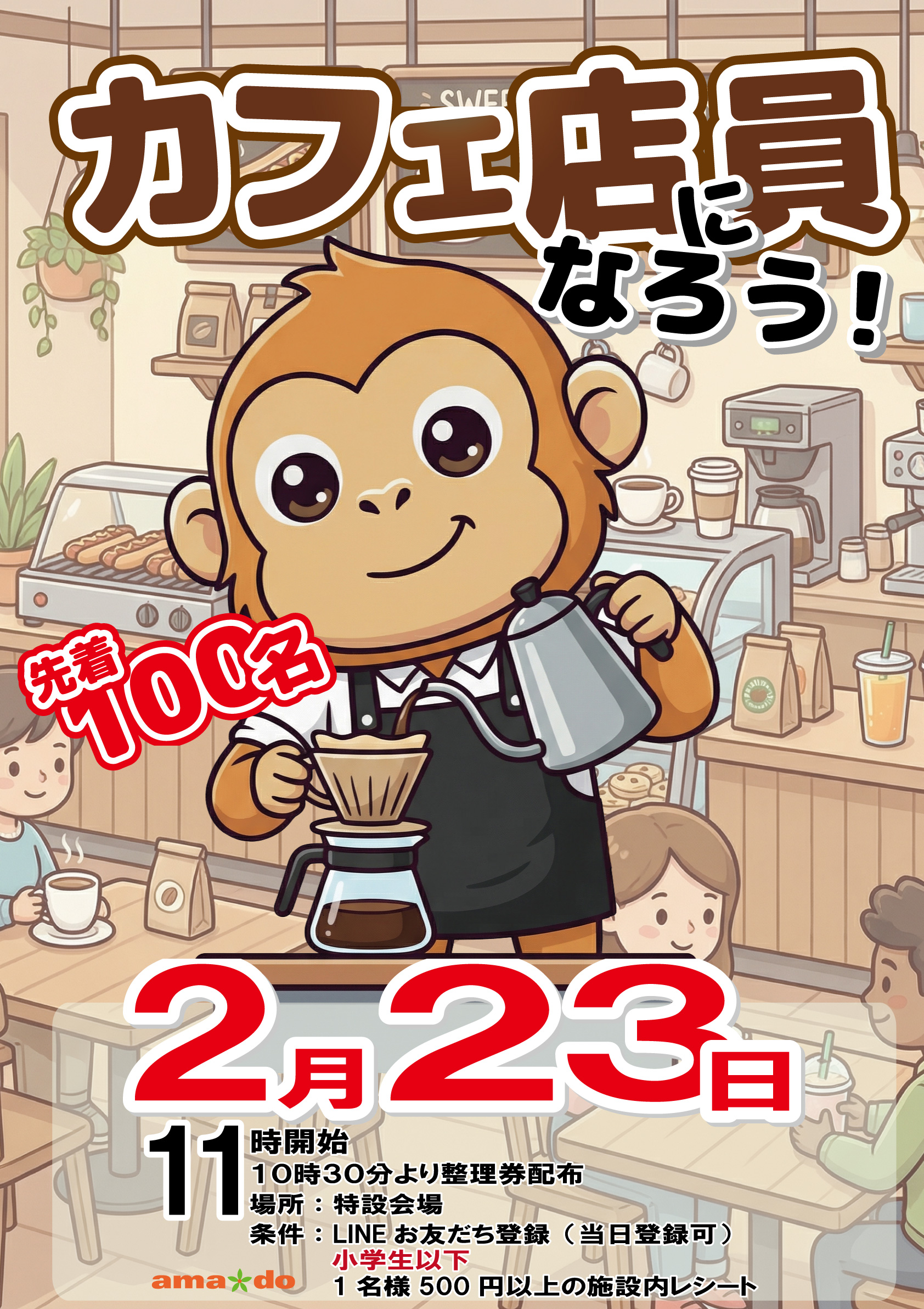 | 条件 | 小学生以下(※1家族につき2名のお子様まで) 先着100名様 アマドゥLINE公式アカウント友だち登録が必要です。 お友だち登録はこちら 施設内レシート(1人500円以上) |