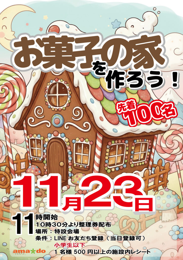2025年10月7日 / 最終更新日時 : 2025年10月7日 amado イベント情報 お菓子の家を作ろう! 日程 11月23日 時間 11時~ 場所 1F特設会場 条件 10時30分から整理券配布 先着100名様 LINEともだち登録 小学生以下 施設内レシート 1名様500円以上のレシート(数日前購入分OK) イベント内容 FacebookX