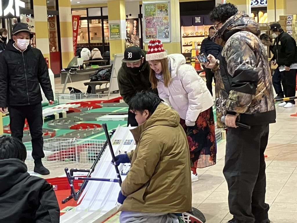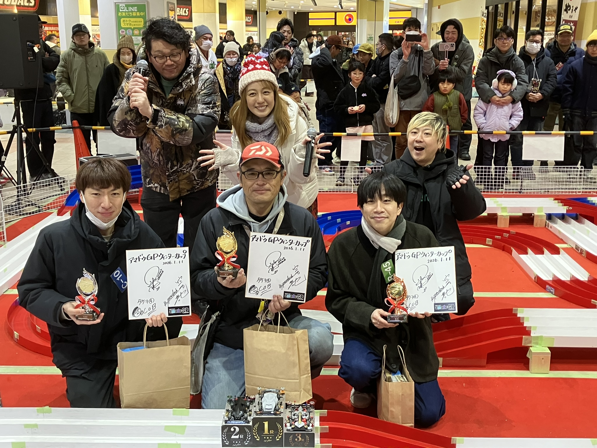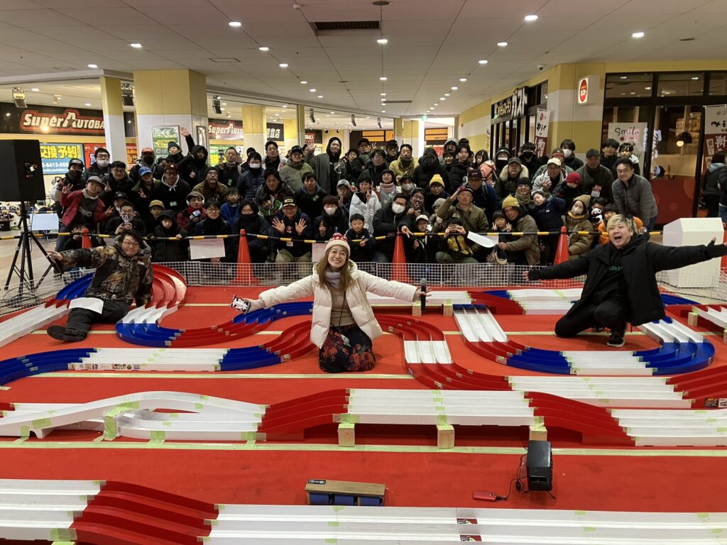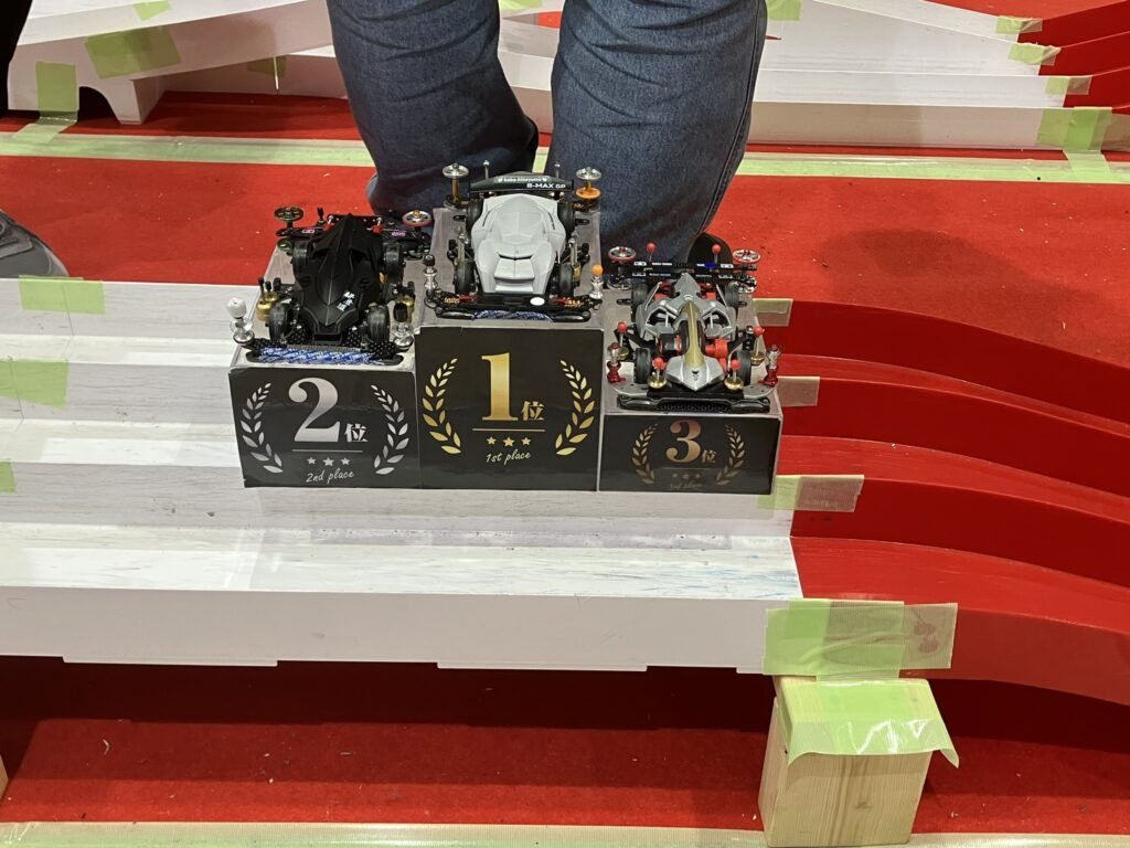 キッズクラス67名、オープンクラス127名。総数194名でした。体調不良によるキャンセルなどもありましたが、たくさんのご参加ありがとうございました。※クウ・リキさん(左)タケヲさん(右)に加え今回はゲストMCとして3回目の及川奈央さん(中央)をお呼びして大盛況でございました。今回は協賛店舗のRACERSさんが物販コーナーを設置。オリジナル商品なども豊富で多くのミニ四駆レーサーで溢れかえっていました♪
